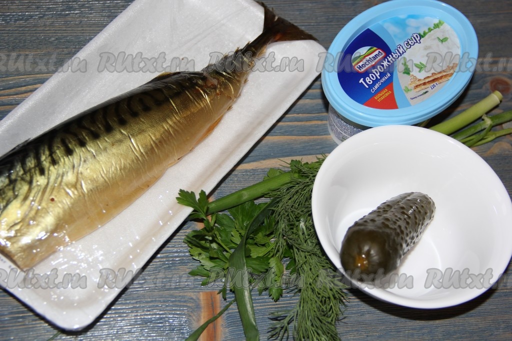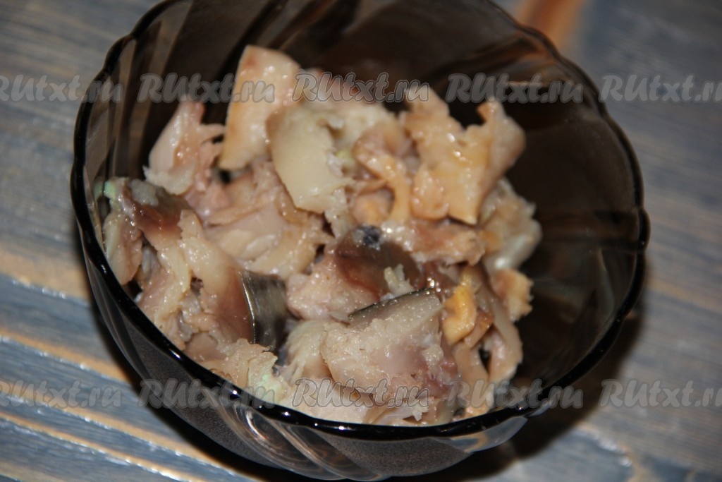 Копчёную рыбу можно взять любую, я приготовила с копчёной скумбрией. Рыбку очистить от костей и нарезать рыбное филе на небольшие кусочки.