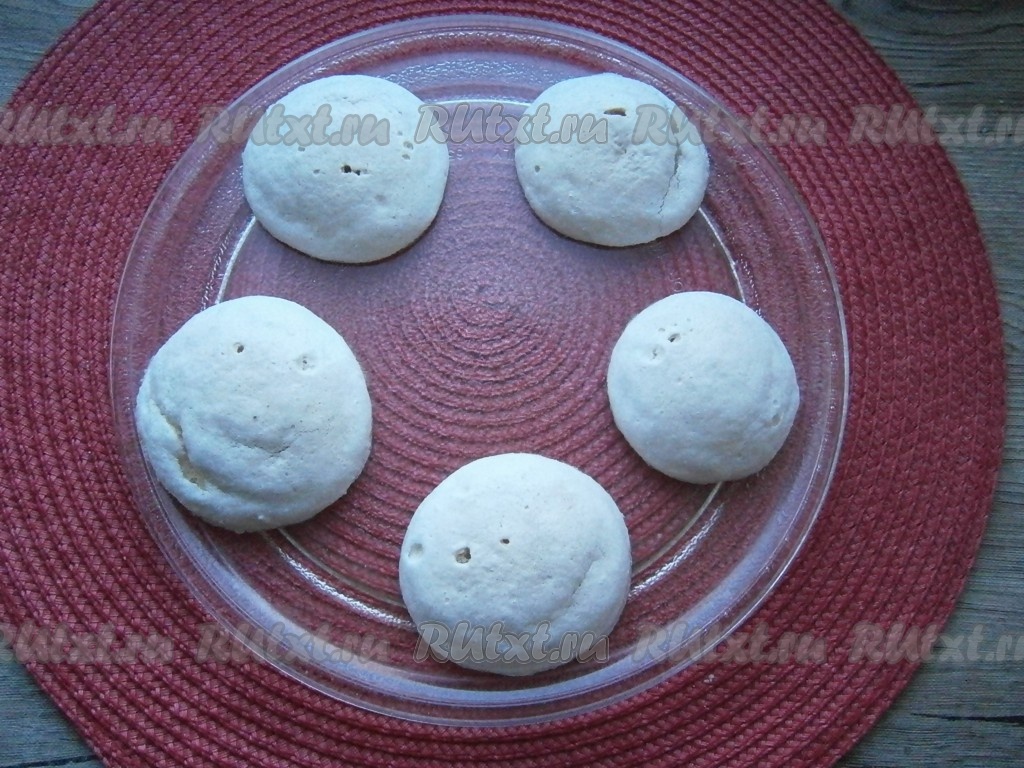 Получились сухие, рассыпчатые, довольно объемные, сладкие лепешки. Вторую партию готовить только после полного остывания тарелки. Замечательные безе, испеченные в микроволновке, можно подавать к чаю или использовать для украшения и приготовления тортов, пирожных.