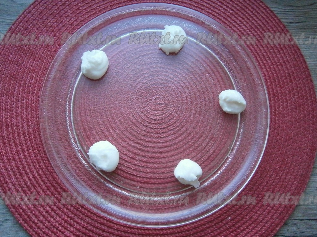 На большую стеклянную тарелку из микроволновки выкладывать по 0,5-1 чайной ложке массы в виде маленьких комочков на расстоянии друг от друга около 8-10 см (безе в процессе выпечки сильно увеличится в размере). Комочки лучше выкладывать по краю тарелки, в центре тарелки они будут подгорать в процессе приготовления. Если у вас масса получилась слишком густой, выкладывайте ее в виде шариков, формируя их влажными руками.