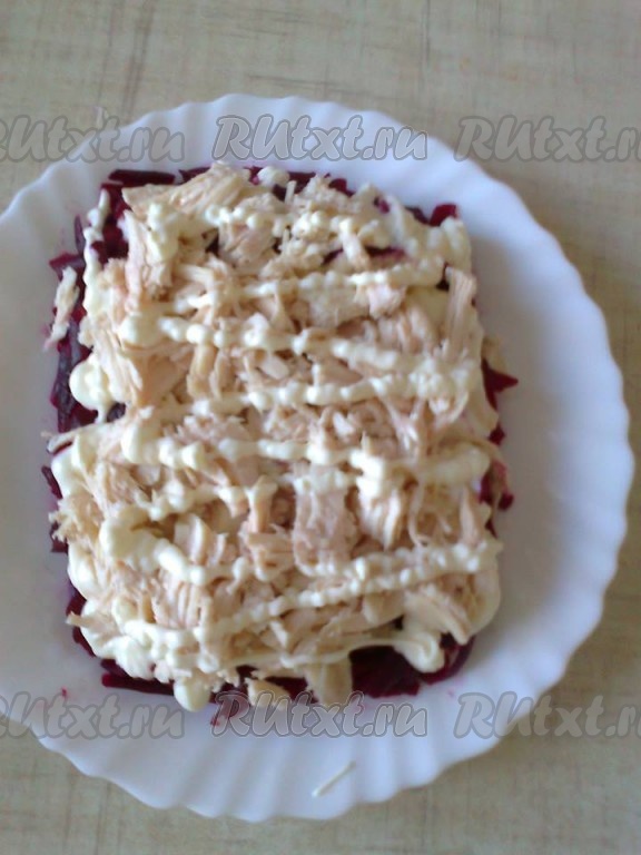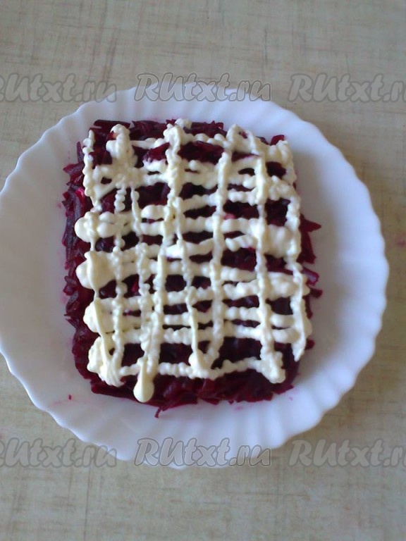 Для 1 слоя используем половину натертой свеклы, выкладываем на тарелку в виде прямоугольника, смазываем майонезом.