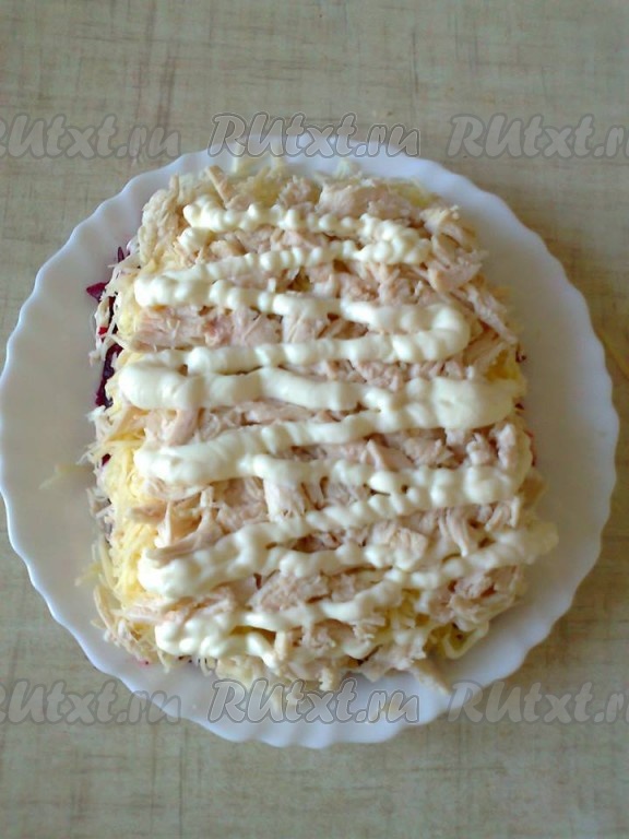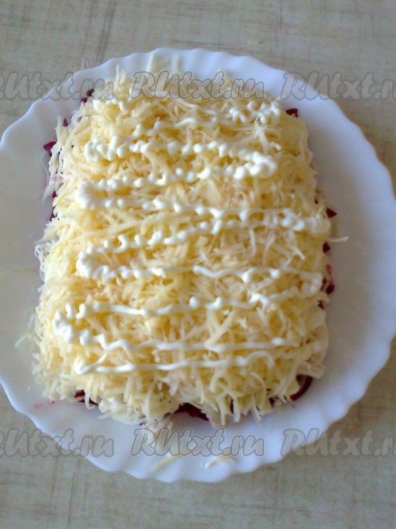 Для 6 слоя используем вторую половину натертой свеклы, смазываем майонезом.