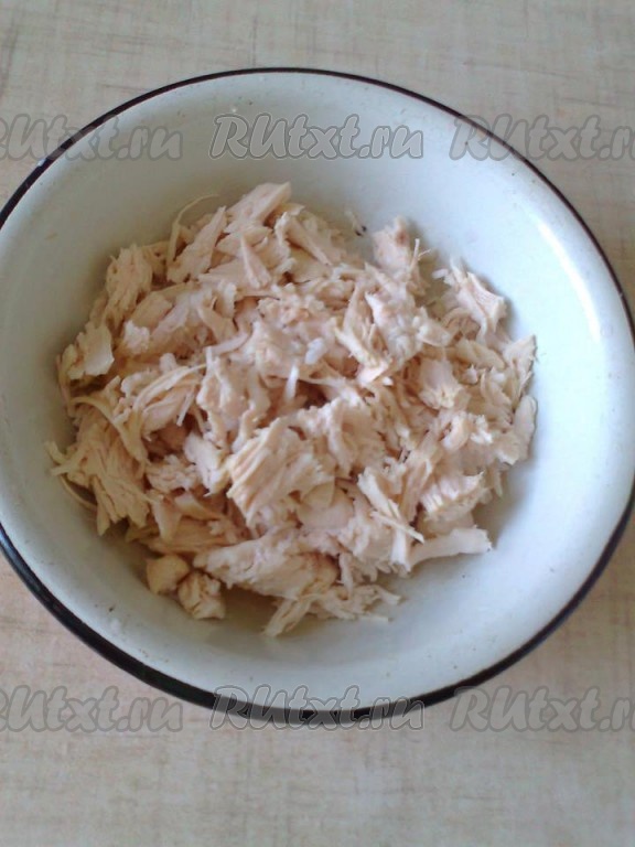 Отварное филе нарезать соломкой или порвать руками, можно заправить майонезом или хорошо промазать слой майонезом в салате, чтобы мясо не было сухим, посолить, поперчить, при необходимости.
