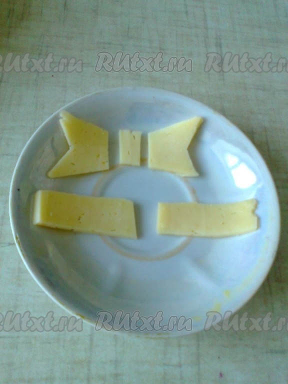 Из сыра сначала вырезать украшения - бантик и полосочки.