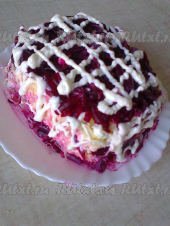 Аккуратно покрываем верх и бока салата слоем свеклы, которую натерли для украшения салата. Выкладываем полоски из свеклы. Верхний слой можно украсить гранатовыми зернами, если такие имеются (или по желанию).