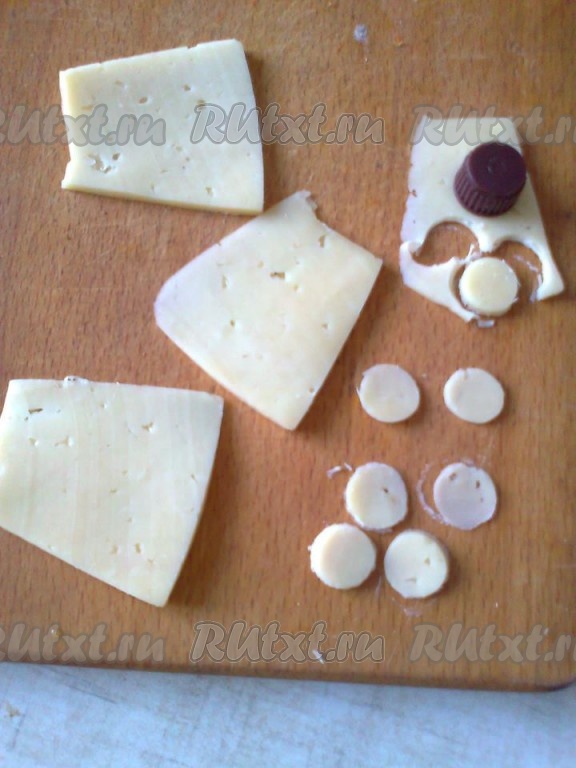 Кружки вырезала из сыра с помощью крышки от йода, можете придумать свой вариант.