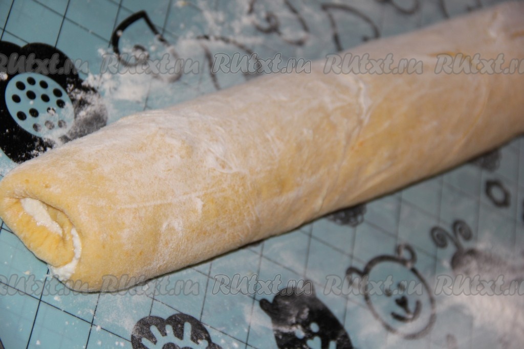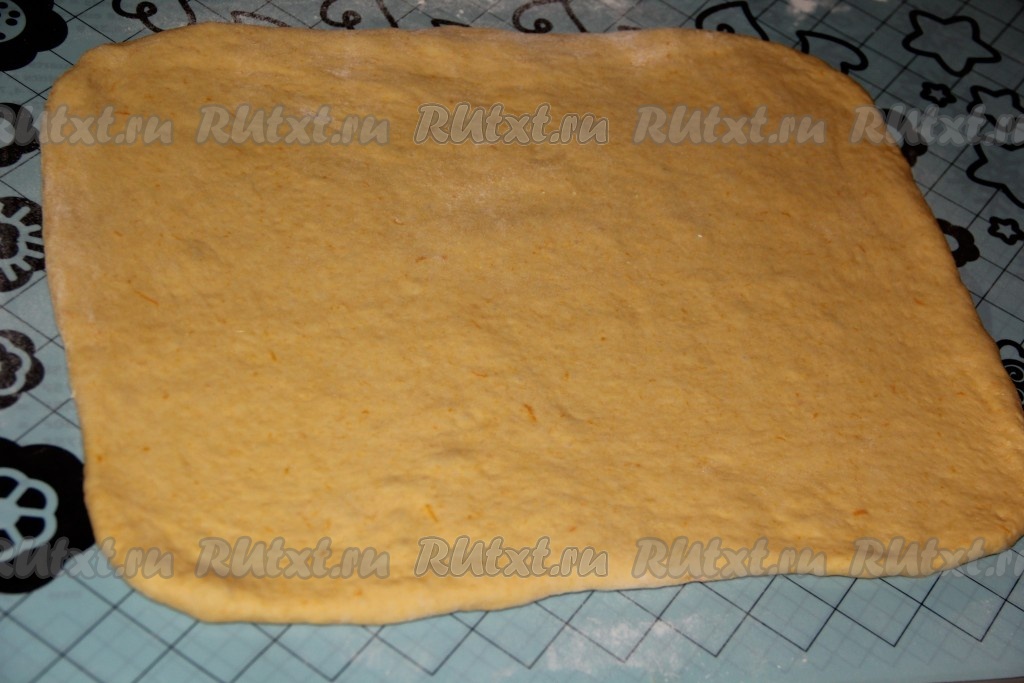Готовое тыквенное тесто, замешанное в хлебопечке или вручную, хорошо обмять и на столе (или на силиконовом коврике), присыпанном мукой, раскатать в прямоугольный пласт толщиной 0,5-1 см.