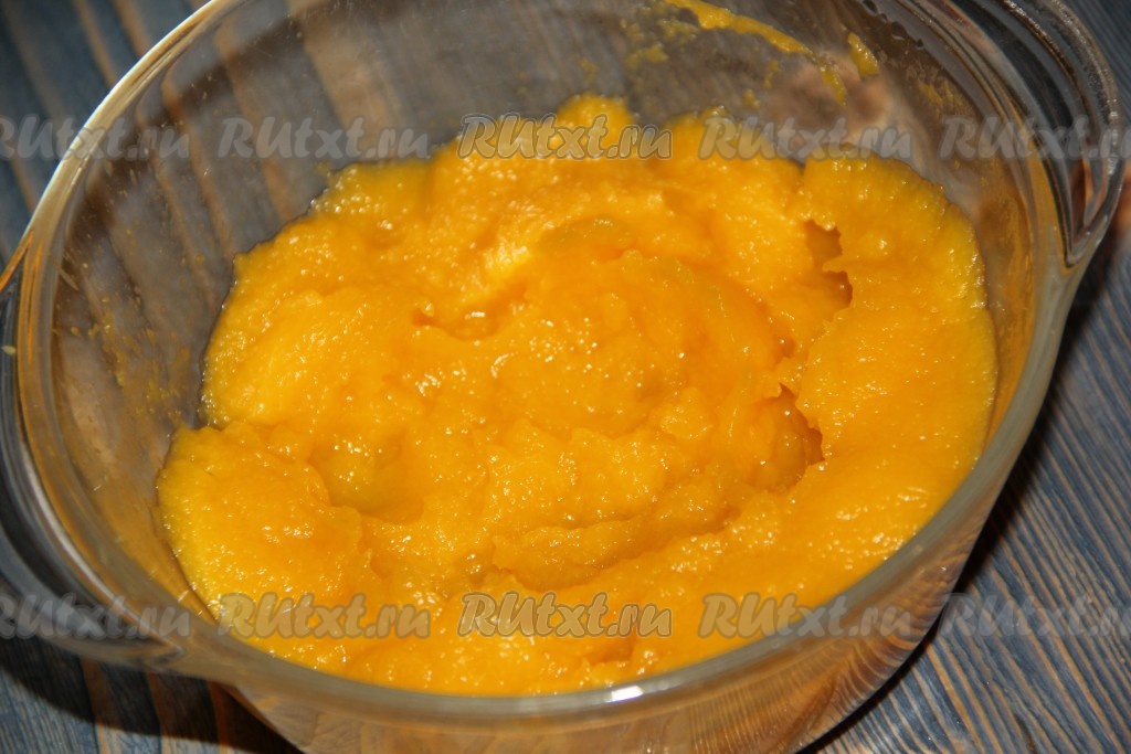 Тыкву, предварительно очищенную от кожуры и семян, нарезать на кусочки и поместить в стеклянную посуду. Запечь тыкву в микроволновке при максимальной мощности в течение, примерно, 10 минут. Тыква станет мягкой. С помощью погружного блендера пробить тыкву в пюре. Для замешивания теста нам понадобится 210 грамм тыквенного пюре.