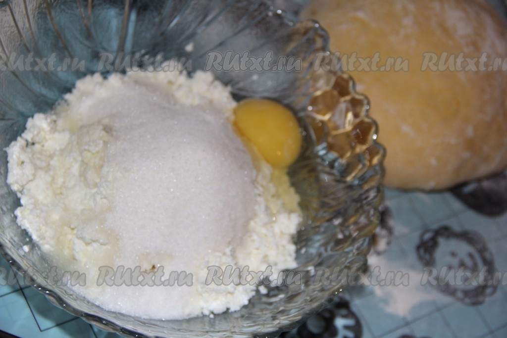 Для приготовления начинки соединить творог, сахар и яйцо.