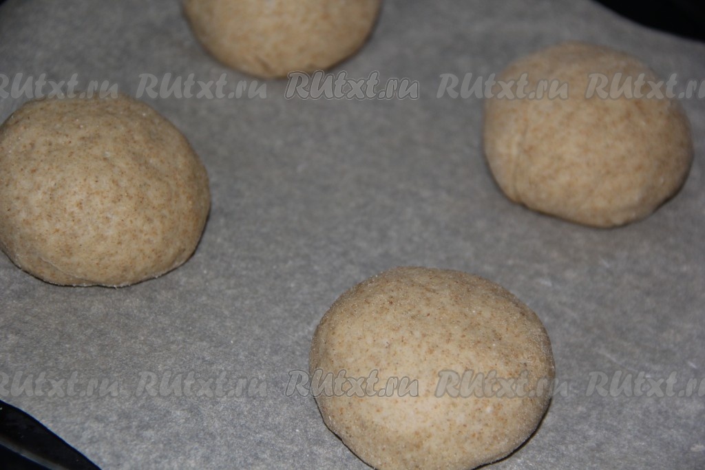 Готовое тесто обмять и разделить на 8 частей. Сформировать круглые булочки и выложить их на расстоянии друг от друга на противень, застеленный пергаментом (или смазанный маслом). Оставить булочки на противне на 30-35 минут.