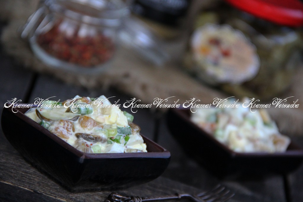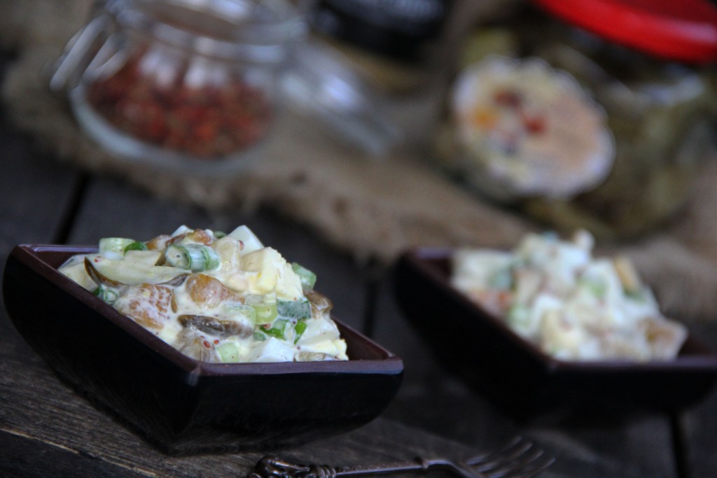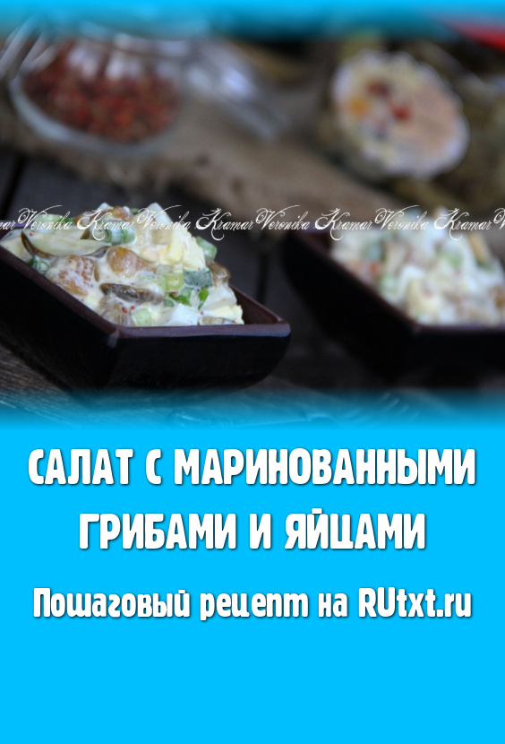 Вкусный, нежный салат с маринованными грибами и яйцами подать к столу. Это блюдо станет и отличной холодной закуской для праздничного стола, и прекрасным дополнением к основному блюду в будний день.