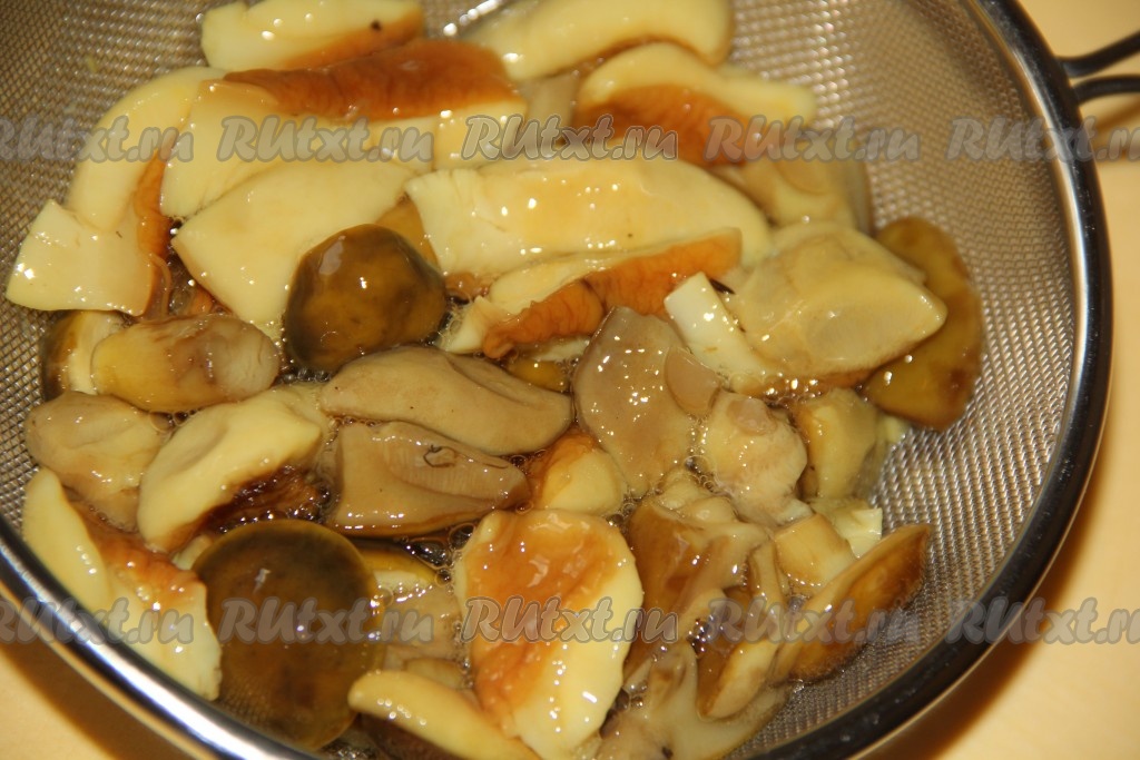 Маринованные грибы откинуть на дуршлаг и дать стечь маринаду. Если грибы крупные, тогда их нужно разрезать на 2 или 4 части. Мелко нарезать грибы не нужно, в салате должны быть чётко видны все ингредиенты.