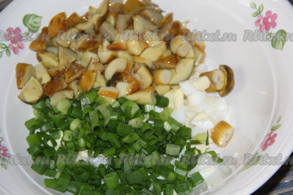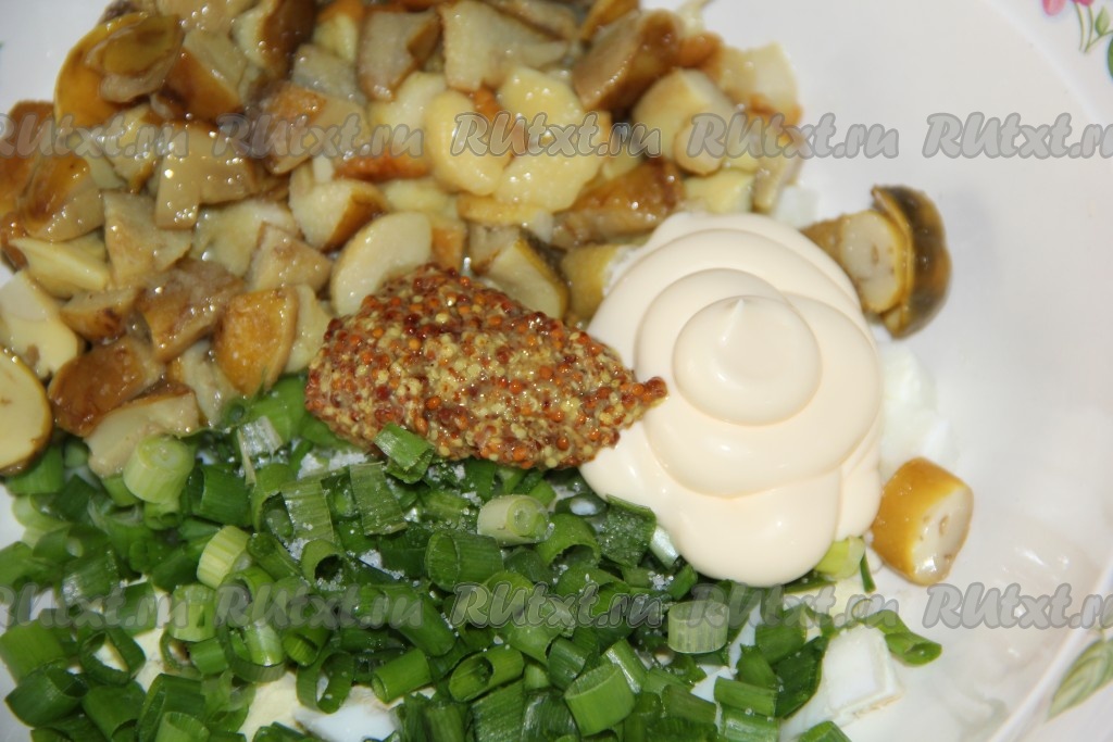 В салат из грибов, яиц и лука добавить майонез, горчицу и соль.