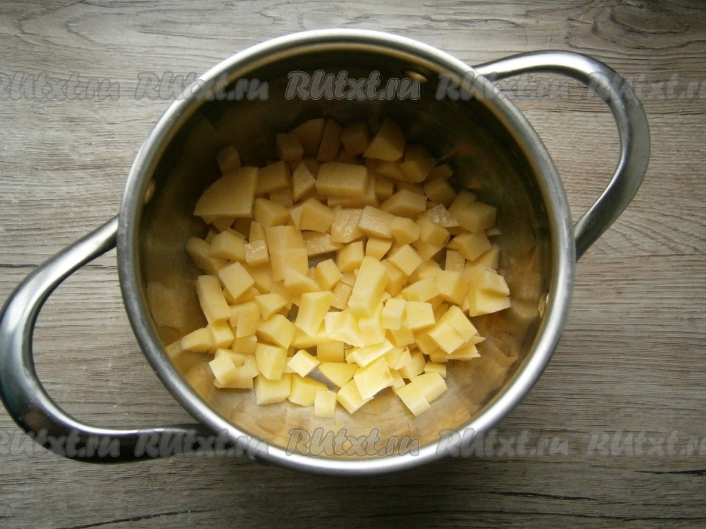 Картофель очистить и нарезать небольшими кубиками в кастрюлю, залить 2 литрами воды, довести до кипения, посолить. Варить картошку на небольшом огне около 20-25 минут.