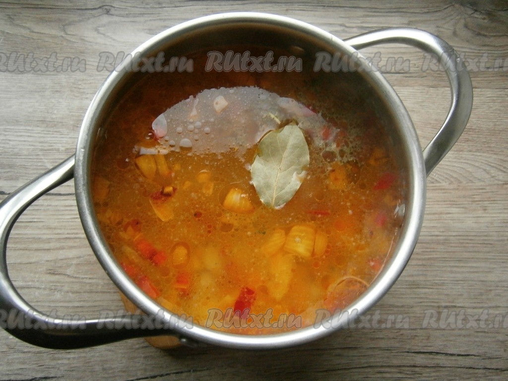 Варить суп с момента закипания на слабом огне около 7 минут, после чего добавить специи и лавровый лист.