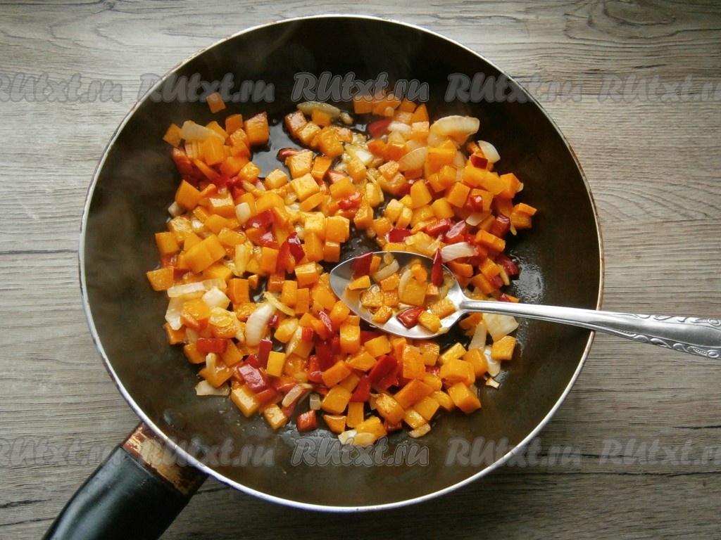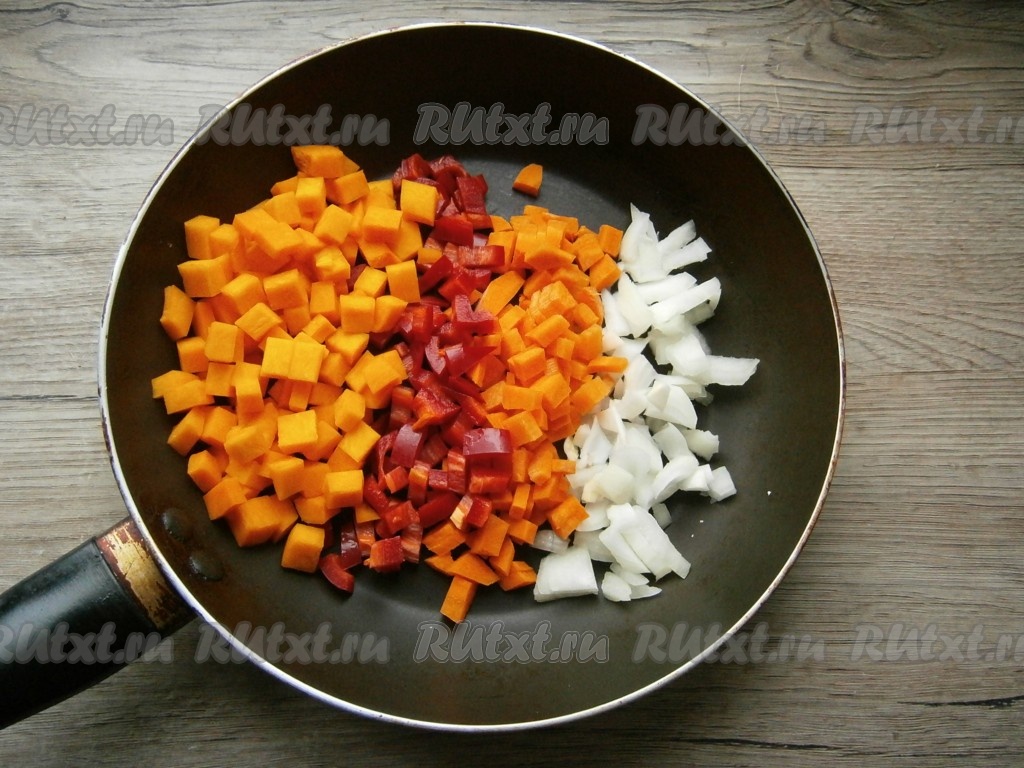 Очистить морковку, лук, чеснок, из болгарского перца удалить семена. Нарезать небольшими кубиками лук, морковь, сладкий перец и мякоть тыквы, поместить в сковороду с растительным маслом.