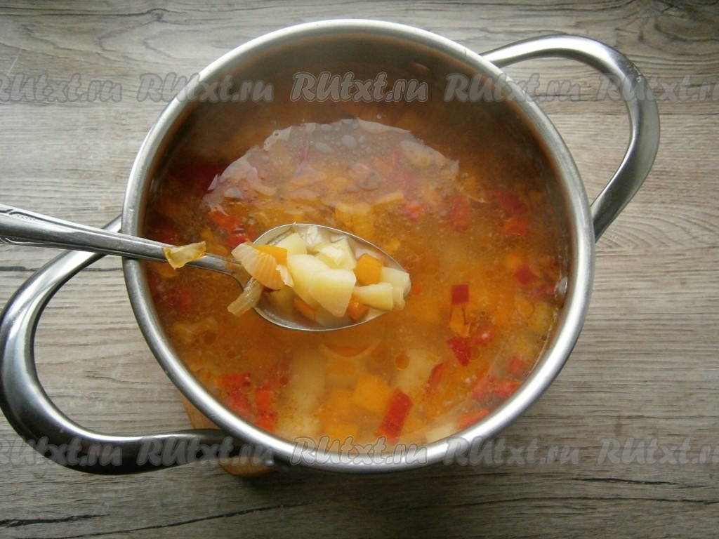 Когда картошка сварится (станет мягкой), выложить в кастрюлю обжаренные овощи.
