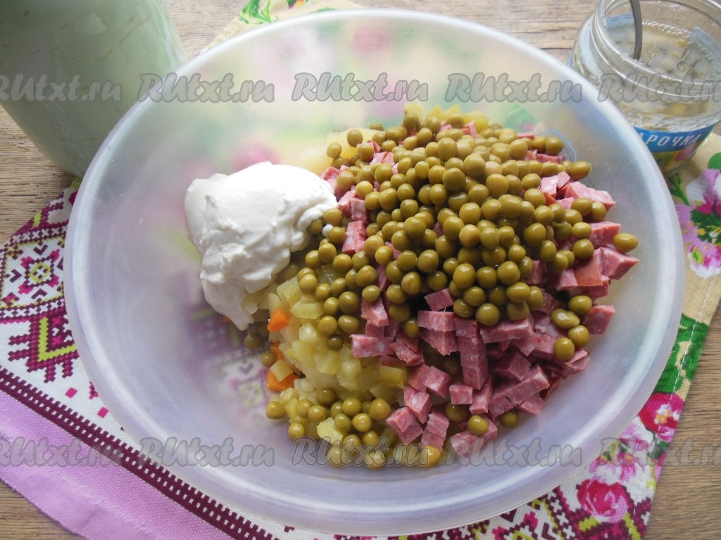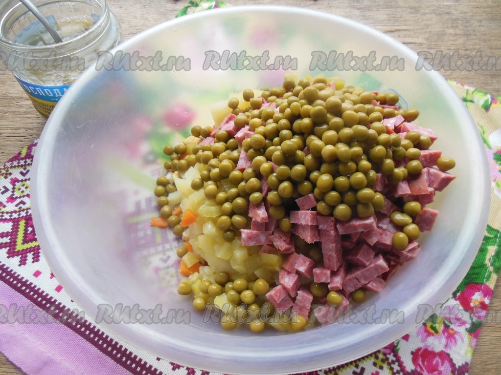 Переложите нарезанные картошку, морковку, яйца, огурцы и копченую колбасу в глубокую тарелку, добавьте зеленый консервированный горошек без жидкости.
