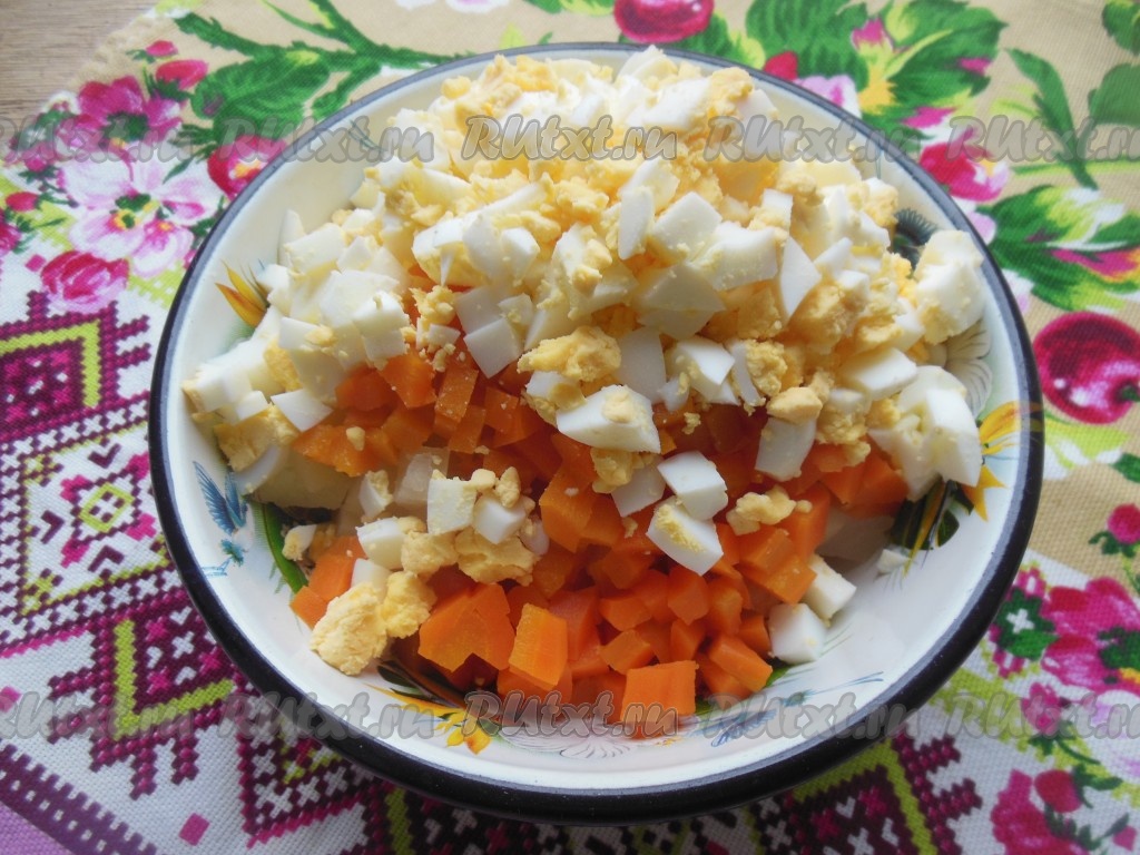 Нарежьте небольшими кубиками морковь, картофель и куриные яйца. Старайтесь, чтобы нарезанные кубики были в салате максимально одинакового размера.
