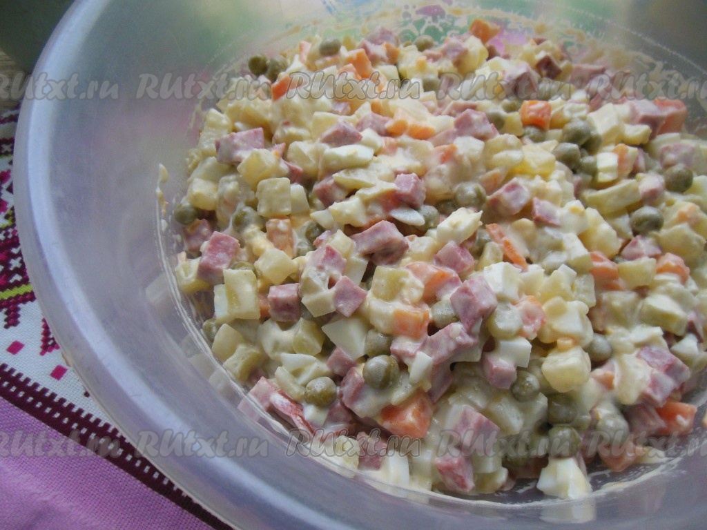 Тщательно перемешайте. Соль в салат я не добавляю, так как майонез, копченая колбаса и огурцы достаточно соленые, вы же ориентируйтесь на свой вкус. В салат "Оливье" никогда не добавляю репчатый лук и зелень.
