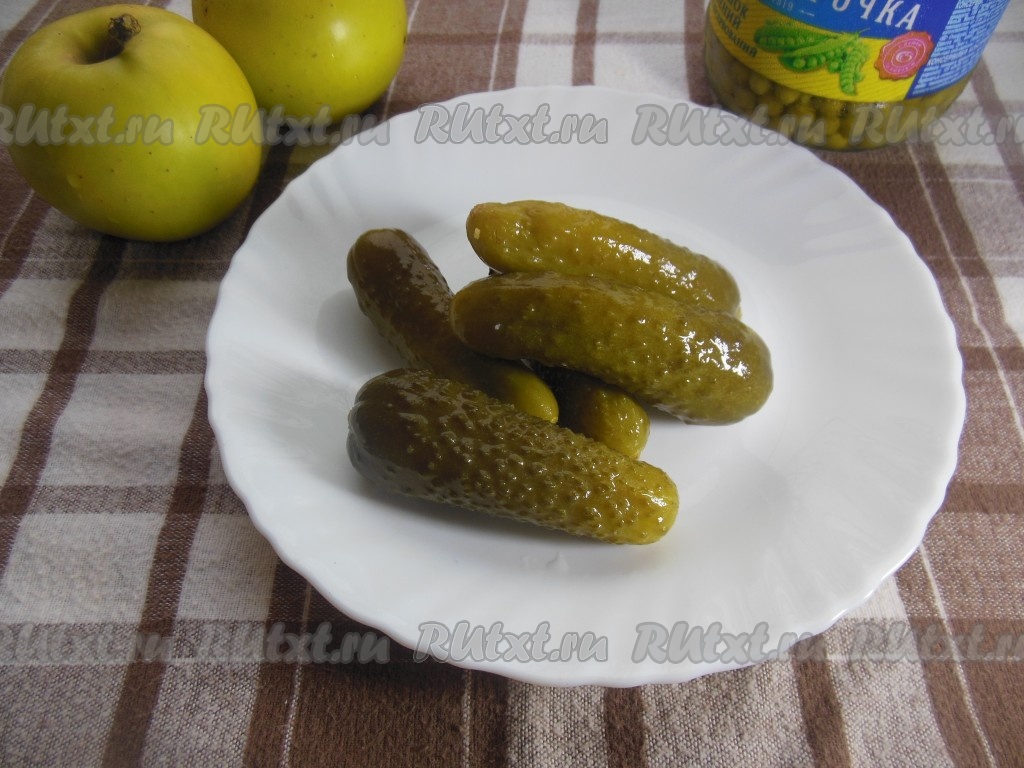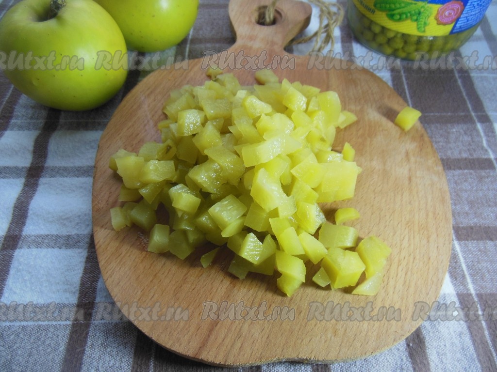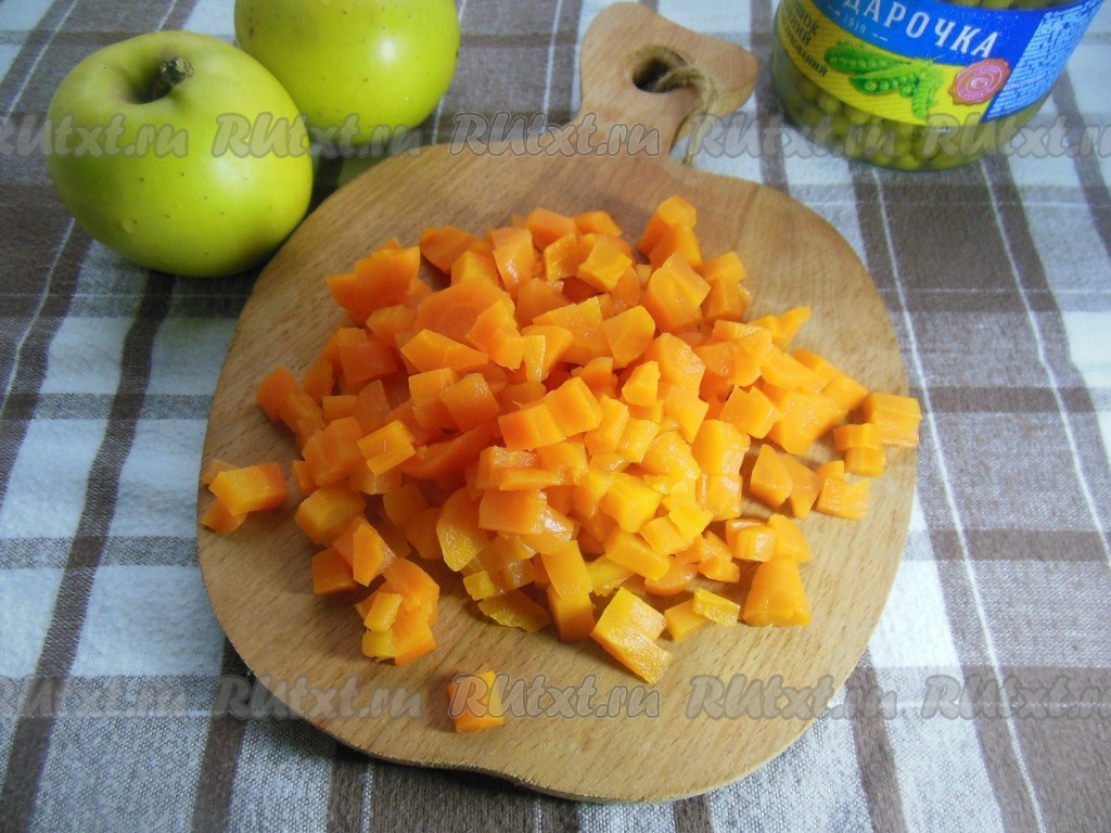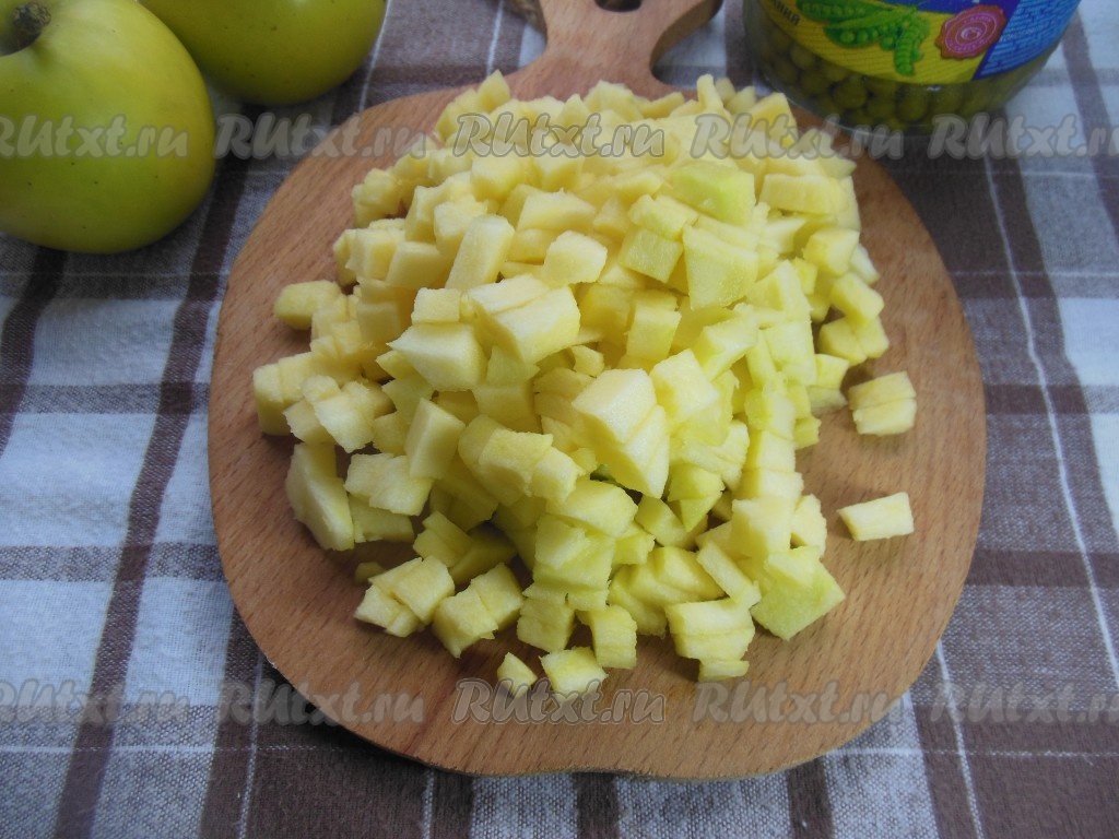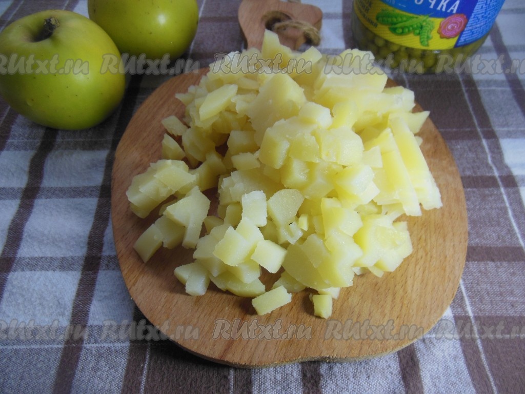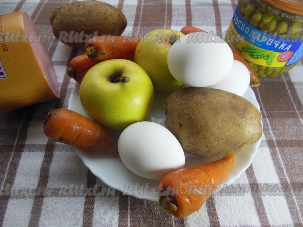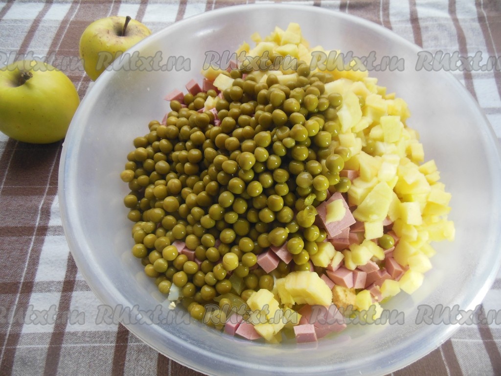 Картошку, яйца, колбасу, огурцы, морковь, яблоки сложите в глубокую тарелку, добавьте зеленый консервированный горошек без жидкости.