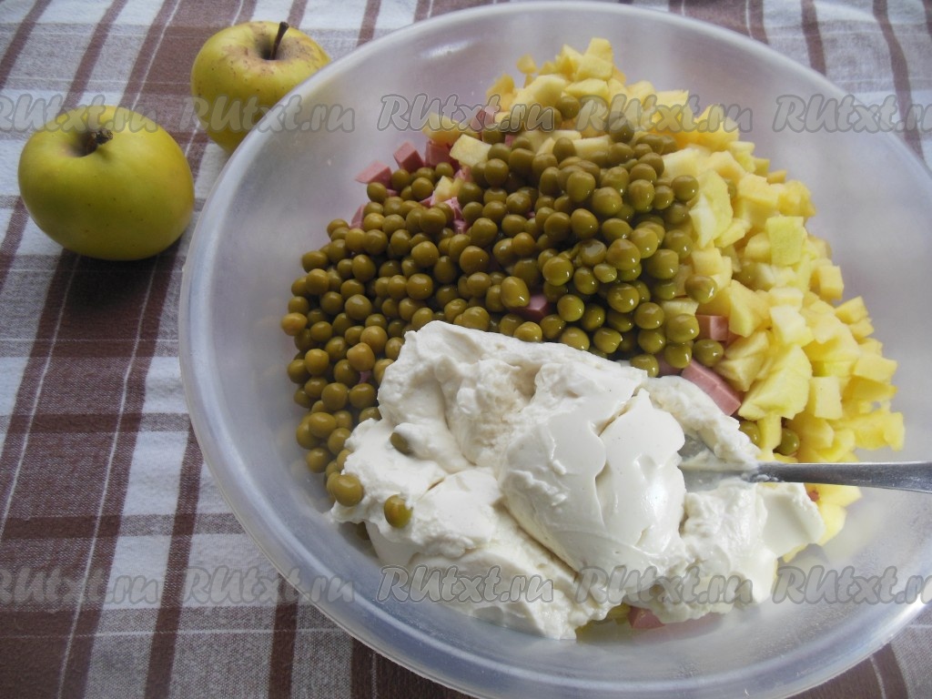Заправьте салат "Оливье", приготовленный с колбасой и яблоком, майонезом (я заправляю домашним майонезом, приготовленным на молоке без добавления яиц).