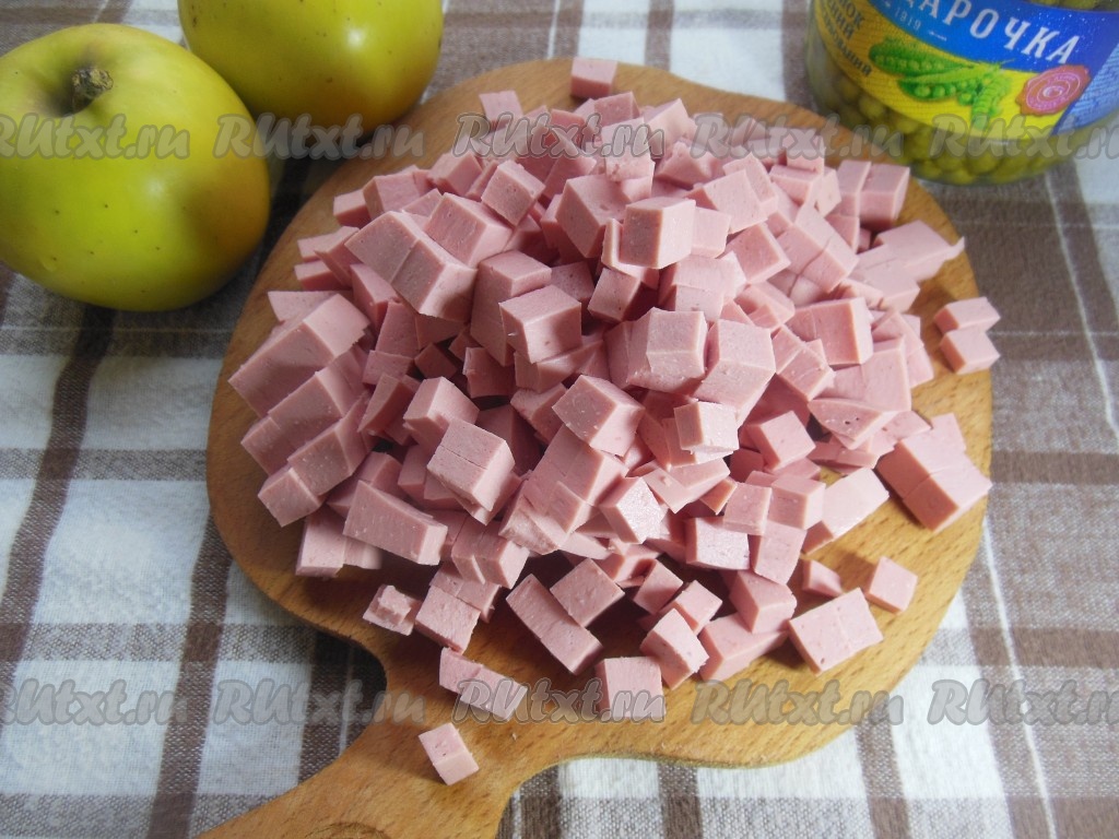 Вареную колбасу нарежьте кубиками. Кстати, колбасу можно заменить в этом салате на курицу.