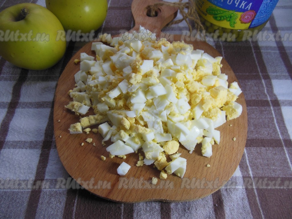 Очищенные яйца тоже нарежьте на небольшие кубики.