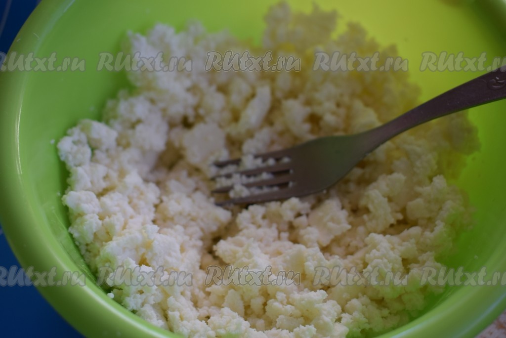 Пока тесто отлеживается, займемся начинкой для халюжей. Для этого разомнем адыгейский сыр вилкой или натрем на крупной терке. Если сыр не соленый, то можно подсолить его по вкусу.
