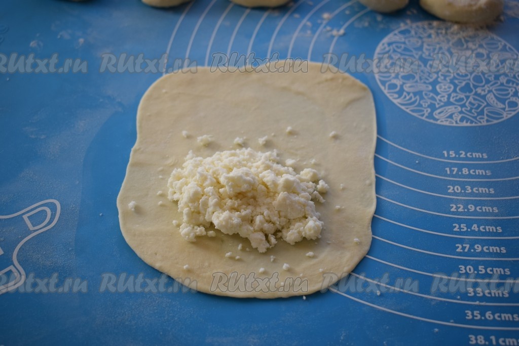 На одну половину раскатанного теста выкладываем чуть больше столовой ложки адыгейского сыра (начинки должно быть достаточно много, так как сыр будет в процессе жарки плавиться, уменьшаясь в размерах).