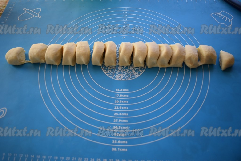 Жгутик делим на 14 частей. В дальнейшем из обрезков теста у нас получится еще 2-3 халюжа, поэтому выход по данному рецепту 16-17 штук. Каждую часть теста обмакиваем в муку с двух сторон.