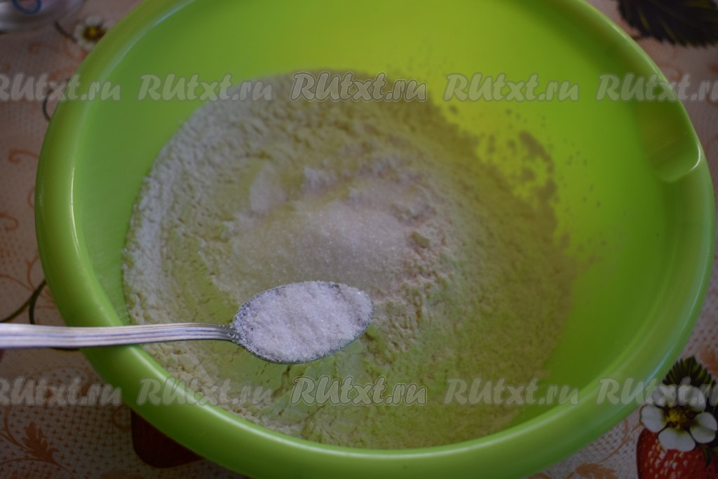 Приготовим тесто для халюжей, для этого насыпаем в глубокую миску просеянную муку, соль, сахар и перемешаем ингредиенты между собой.