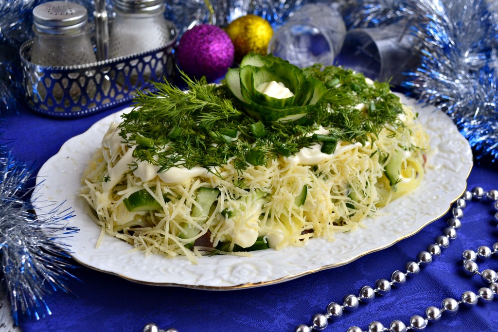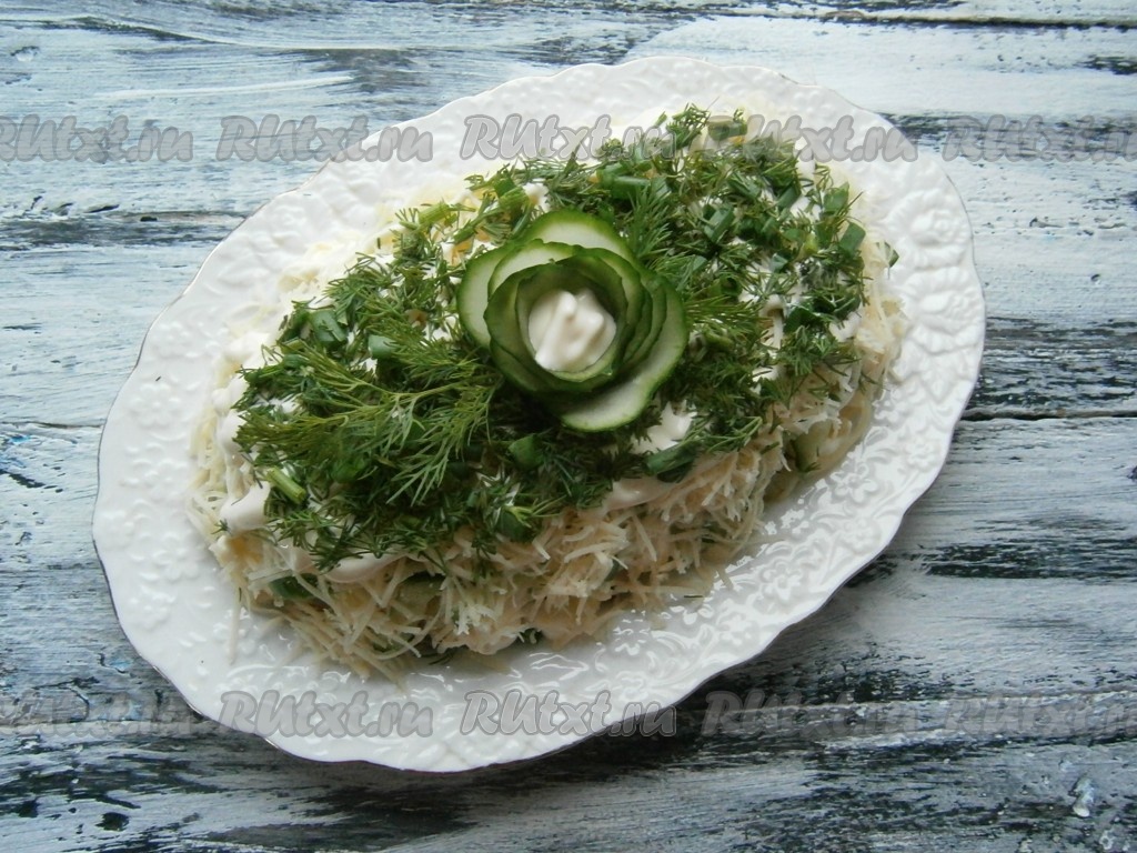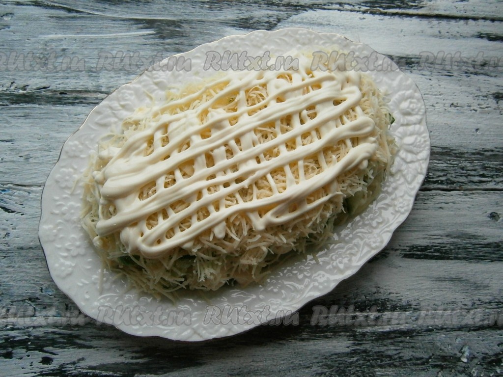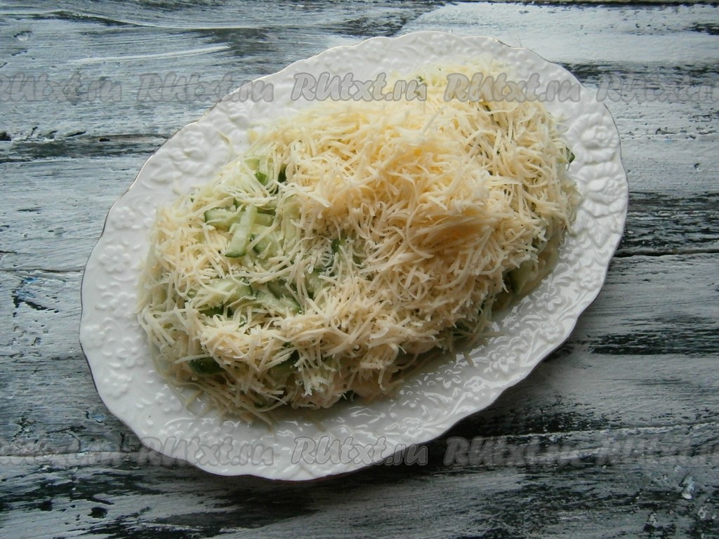 Свежий огурец нарезать тоненькой соломкой (часть огурчика оставить для украшения) и выложить его на картофель. Далее идёт слой натёртого на мелкой тёрке сыра.
