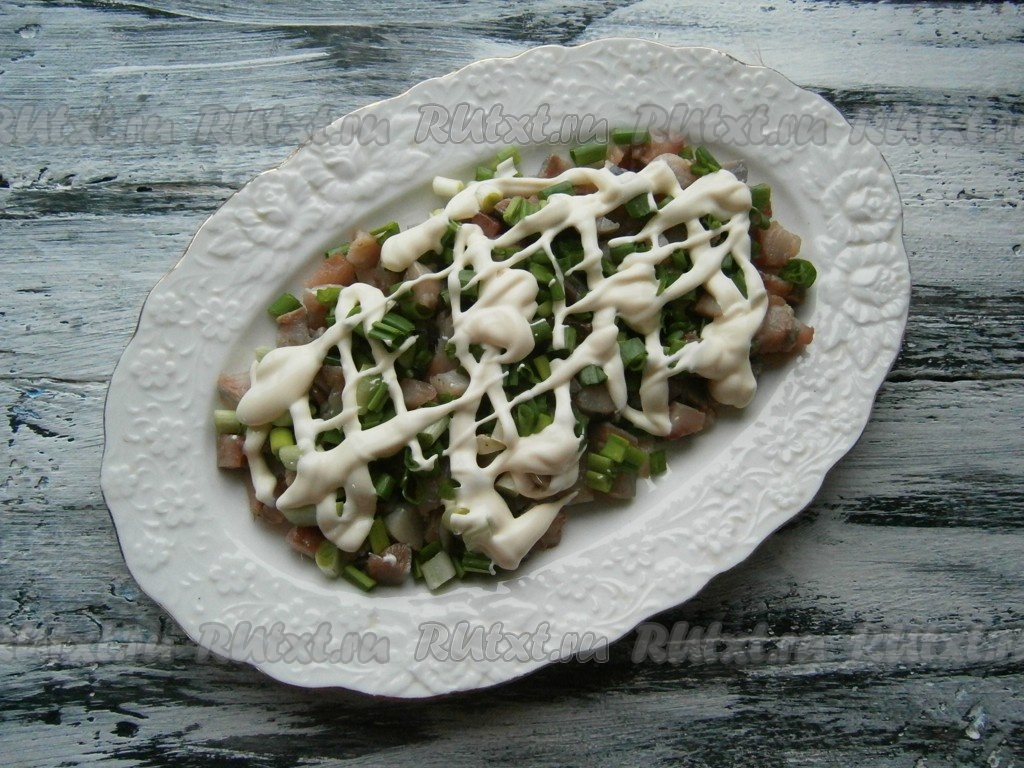 Нарезать селёдку на маленькие кусочки, выложить на блюдо первым слоем, посыпать большей частью мелко нарезанного зелёного лука (немного лука оставить для украшения), смазать слой майонезом.