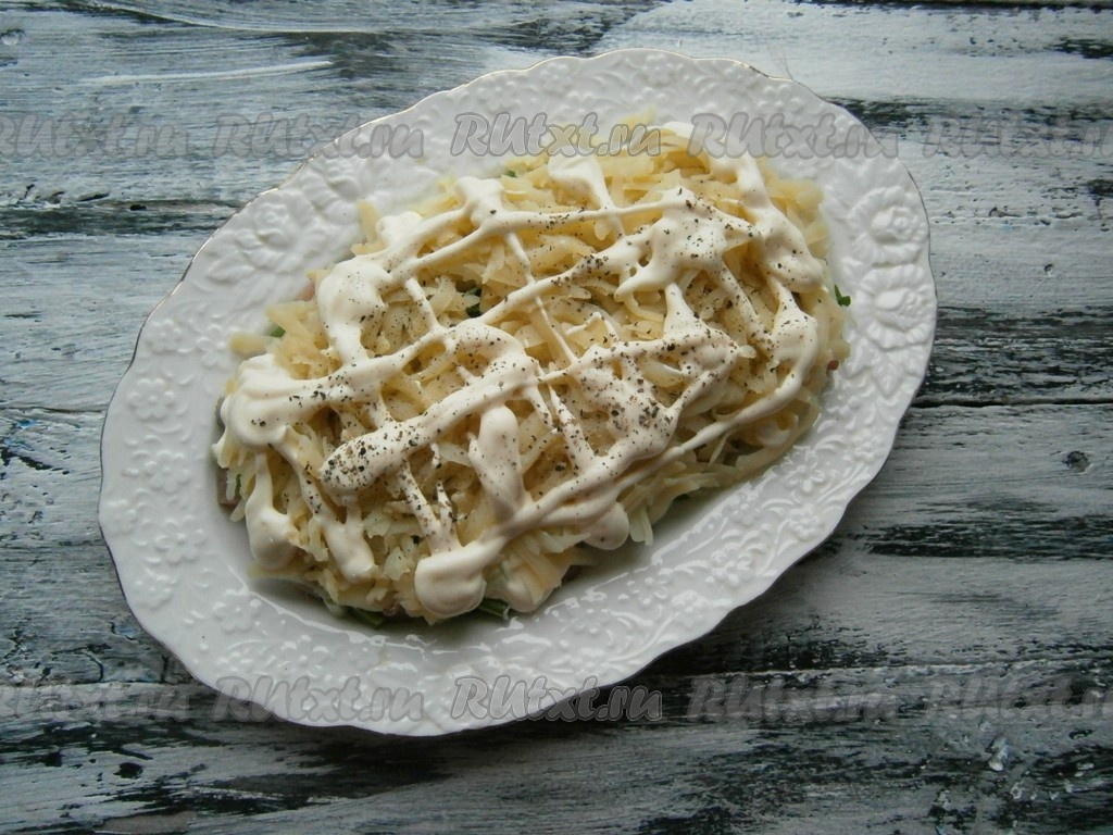 Далее выложить слой очищенного и натёртого на крупной тёрке картофеля, который немного посолить и поперчить, смазать майонезом.