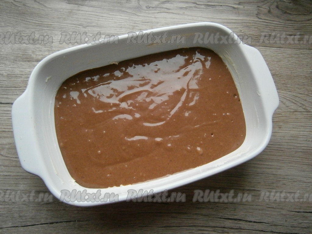 Форму, пригодную для микроволновки (у меня размер формы 20х16 см), смазать хорошо сливочным маслом, вылить в нее тесто.