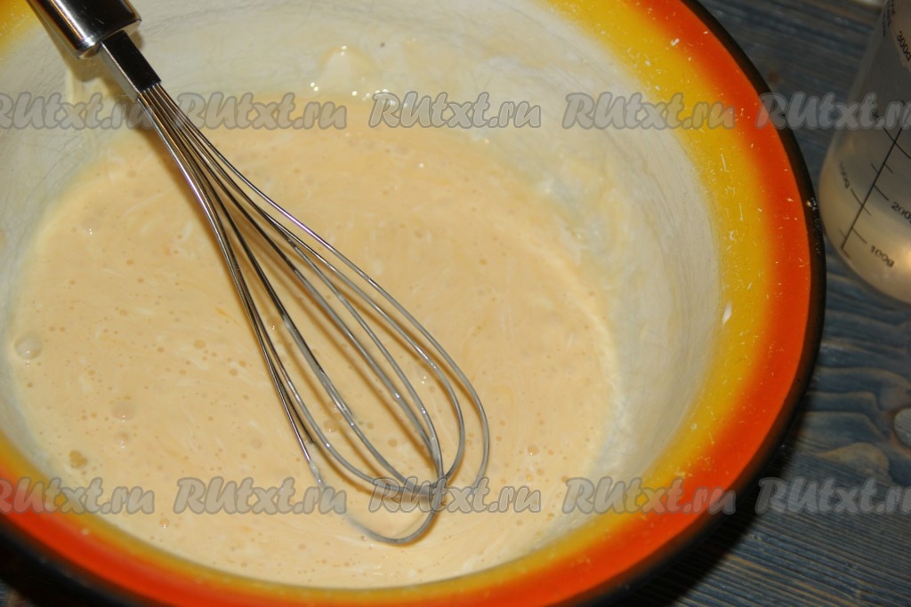 Затем влить тёплую воду (температура воды примерно 38-40) градусов, перемешать. Добавить сахар и начать постепенно подсыпать муку, каждый раз вмешивая её в блинное тесто венчиком.