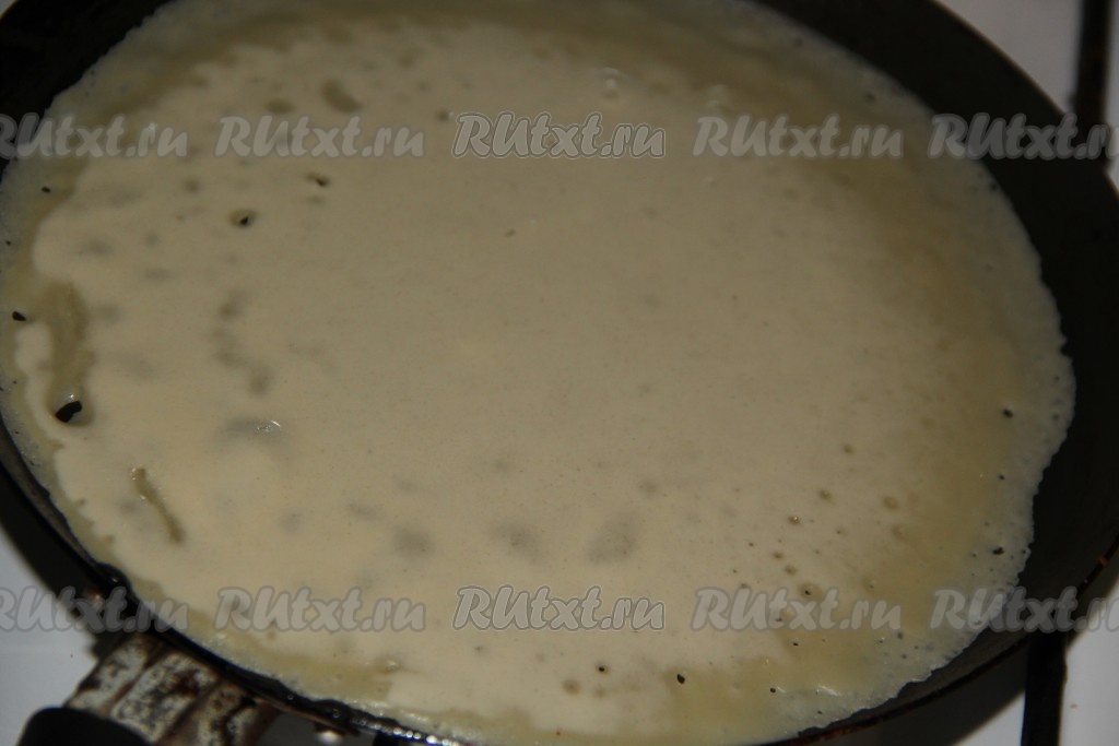 Блинное тесто должно получиться не густым, напоминающим по консистенции кефир средней жирности.