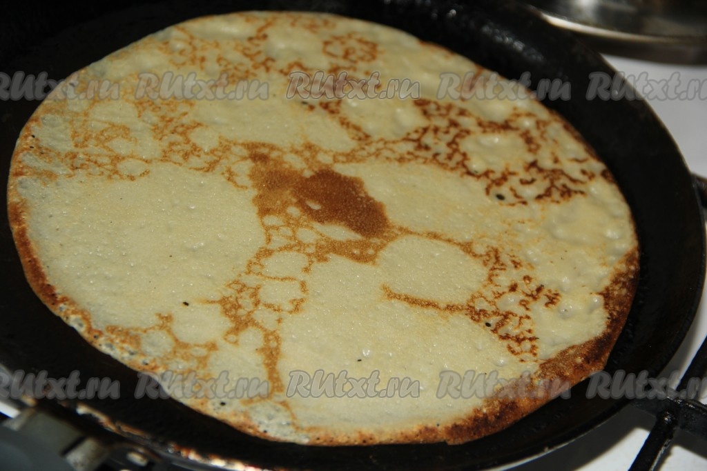 Жарить тонкий блин с двух сторон до золотистого цвета на среднем огне (примерно по 1 минуте с каждой стороны). Блинчики легко переворачиваются. Затем переложить блин на тарелку. Сковороду перед жаркой очередного блина нужно смазывать маслом только по мере необходимости, ведь масло есть в составе блинного теста, но многое, конечно, зависит и от качества покрытия вашей сковороды. Периодически перемешивая блинное тесто в миске, чтобы оно не слёживалось, постепенно пожарить все блины.