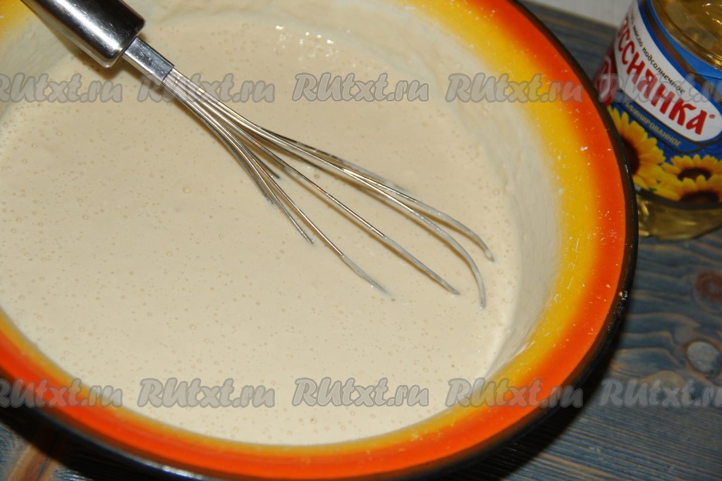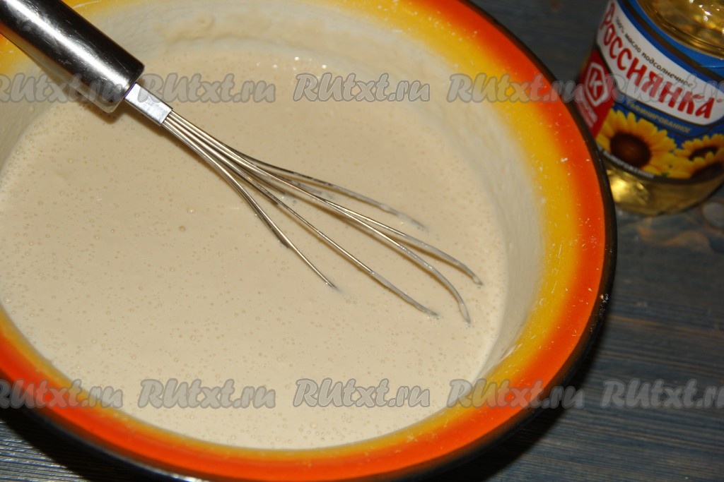 Затем влить растительное масло и хорошо перемешать тесто. Оставить блинное тесто постоять на 10-15 минут.