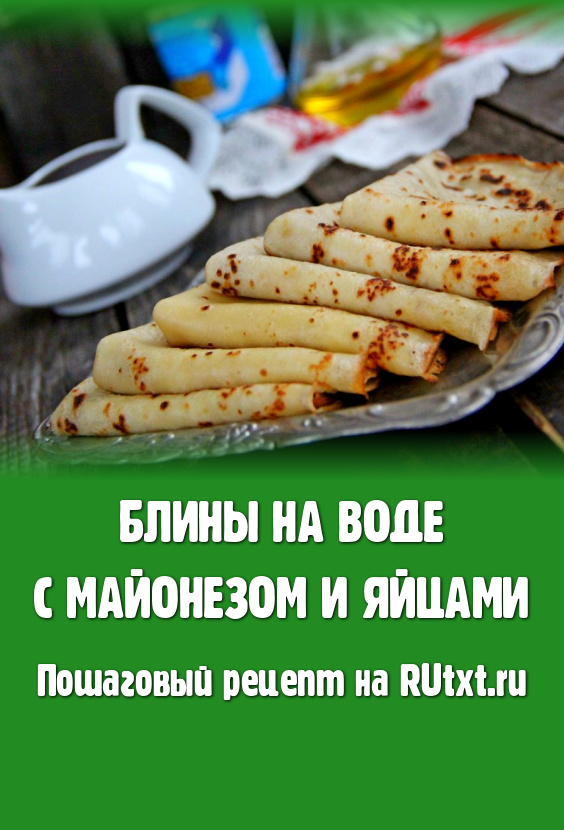 Блины, приготовленные из теста, замешанного на воде, майонезе и яйцах, получаются мягкими, тонкими, аппетитными и вкусными. Подаём к столу их горячими, дополнив, например, сгущённым молоком или сметанкой.