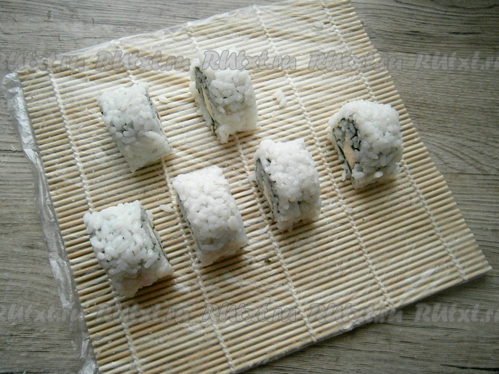 Очень острым и тонким ножом обрезать края и разрезать ролл вначале на 2 части, а затем каждую - еще на 3 части. В итоге должно получиться 6 роллов.