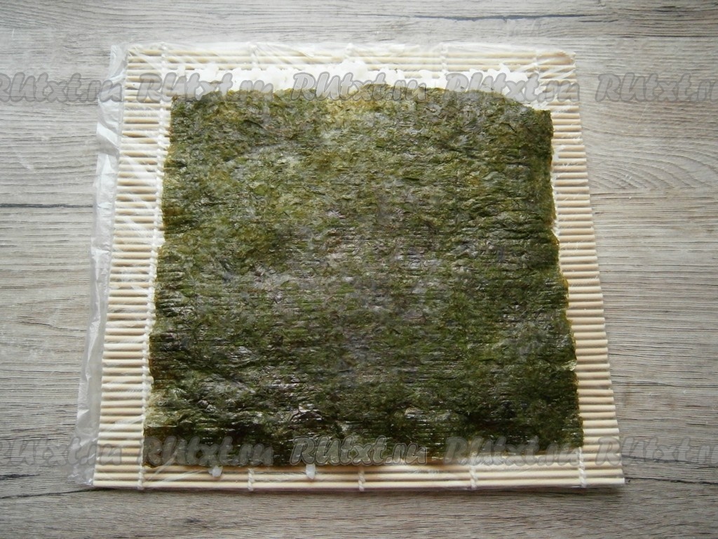 Лист нори расположить на циновке (лучше циновку обернуть пленкой) шершавой стороной кверху. Рис выложить на нори тонким слоем так, чтобы снизу он не доходил до края листа на 1 см, а сверху - наоборот, заходил на 1 см за край листа нори. Это нужно для того, чтобы после сворачивания рис хорошо закрепился и не было голых участков нори.