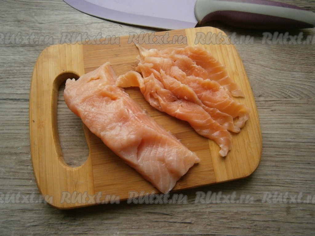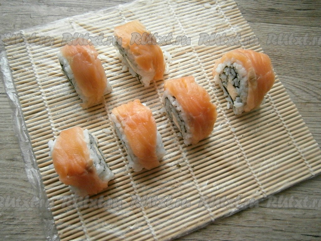 Покрыть каждый ролл сверху и с боков подготовленными тонкими длинными пластинами рыбы, чуть прижимая ее к рису.