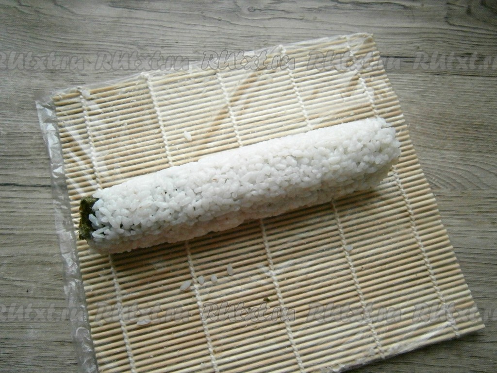 И медленно, аккуратно, помогая циновкой, свернуть все в плотненький рулет. Если все сделано правильно, получится красивый длинный рулет с плотно прилегающим рисом.
