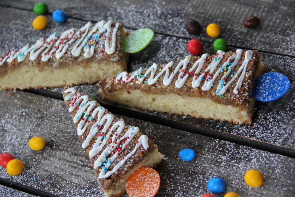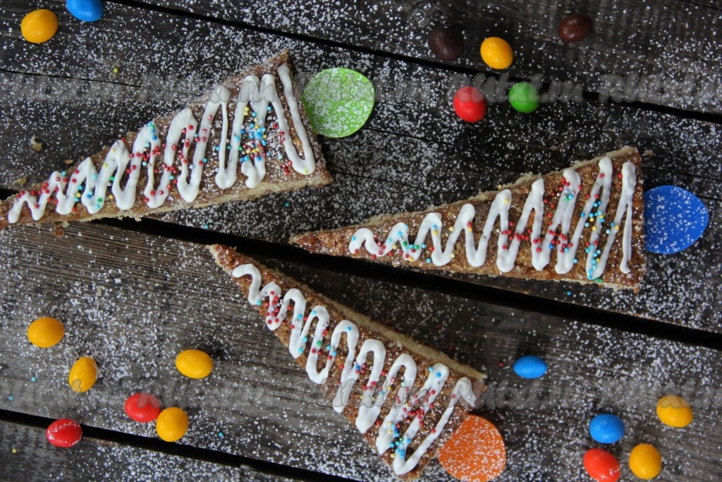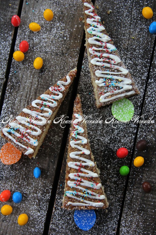 Готовый корж слегка остудить и достать на пергаменте. Снять корж с пергамента и разрезать на высокие треугольники, по форме напоминающие ёлочки.