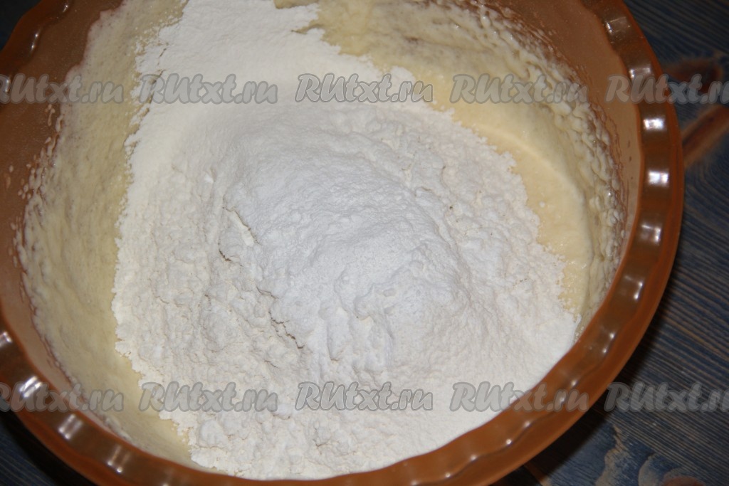 В получившуюся массу всыпать просеянную муку и разрыхлитель.