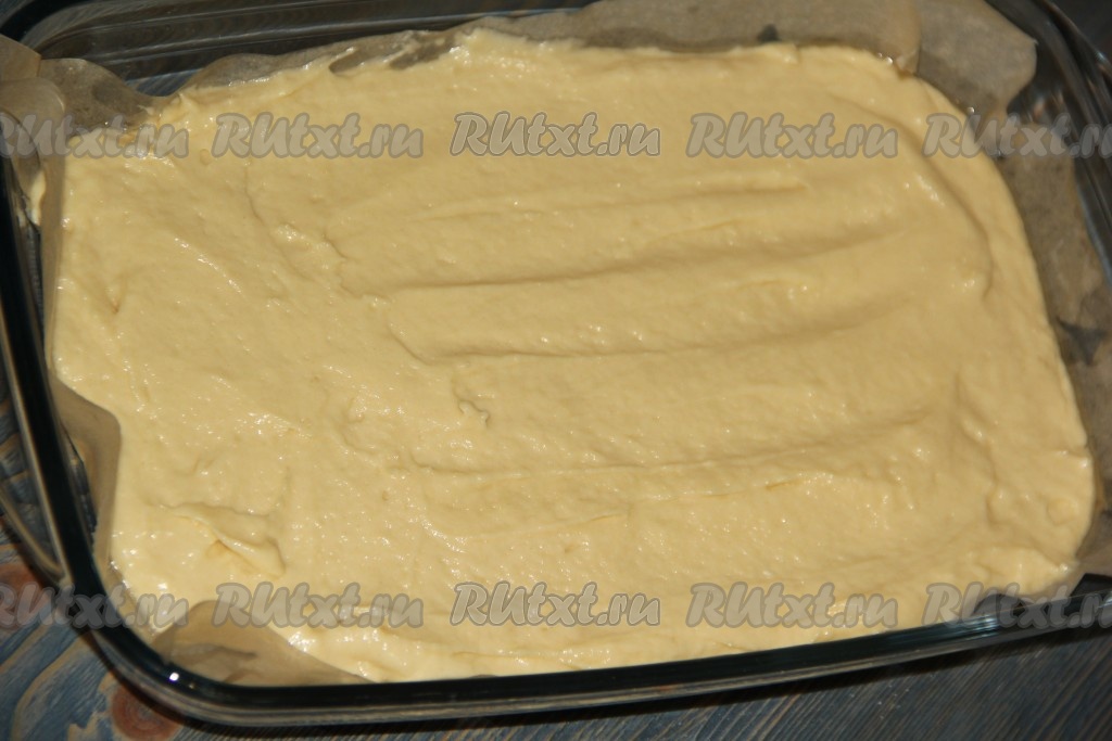 Пергаментом, смазанным растительным маслом, застелить прямоугольную форму для выпечки (у меня форма размером 28Х15 см). Выложить тесто в форму и разровнять.