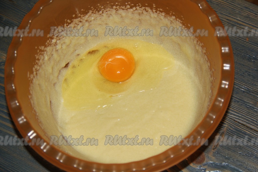 В смесь масла и сахара добавить 1 яйцо, ещё раз взбить миксером.