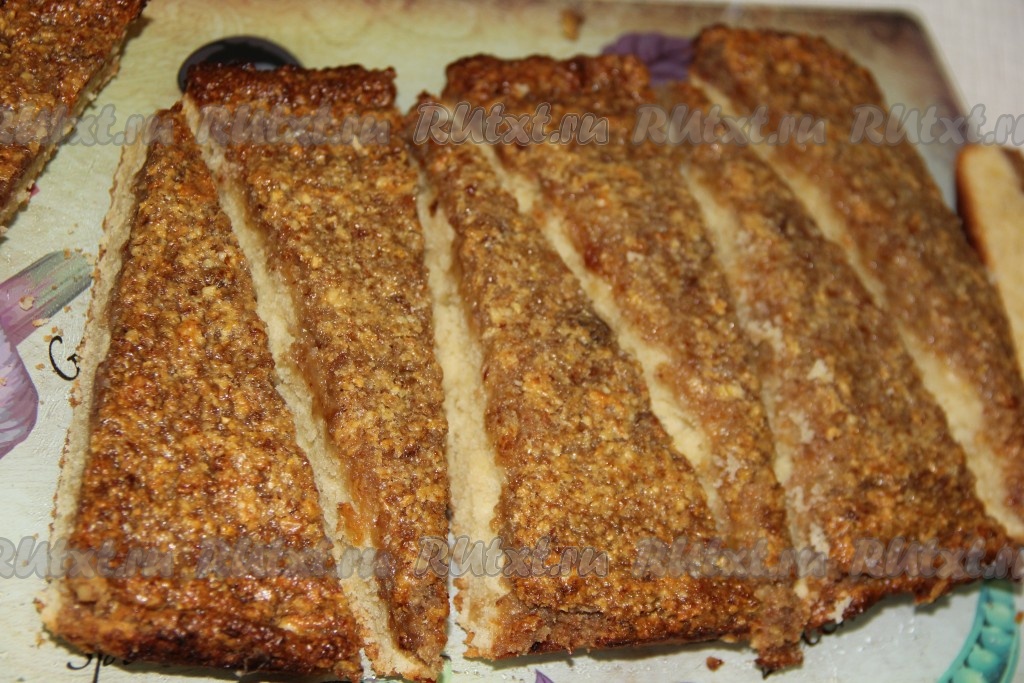 Аккуратно выложить лимонно-ореховую начинку поверх коржа, равномерно распределить. Поставить корж обратно в духовку и выпекать, примерно, 20 минут.