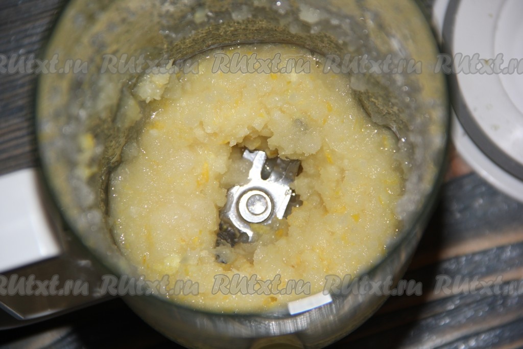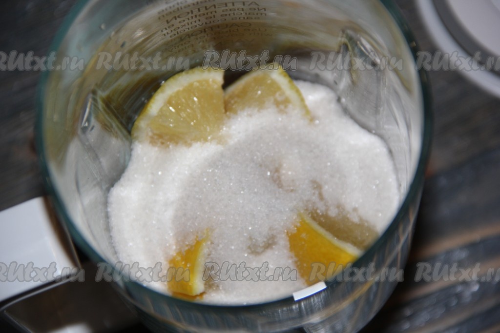Форму поставить в разогретую духовку и выпекать бисквит, примерно, 15 минут при температуре 200 градусов. Пока бисквит выпекается, приготовим начинку для пирожных. Лимон хорошо вымыть и нарезать на несколько долек, поместить в чашу блендера.